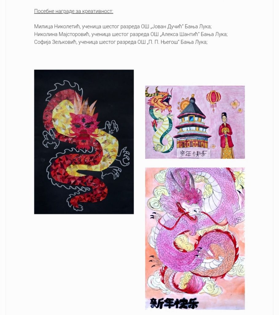 Поводом Кинеске нове године и уласка у годину змаја, Конфуцијев институт Универзитета у Бањој Луци организовао је конкурс ликовних радова за ученике основних и средњих школа.