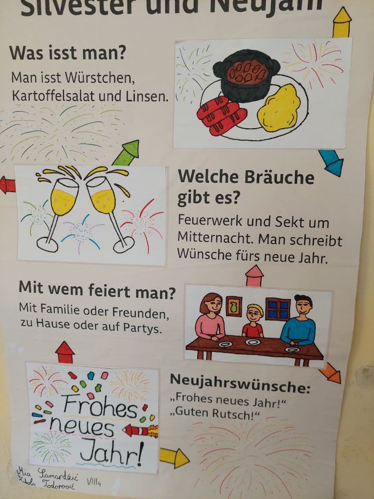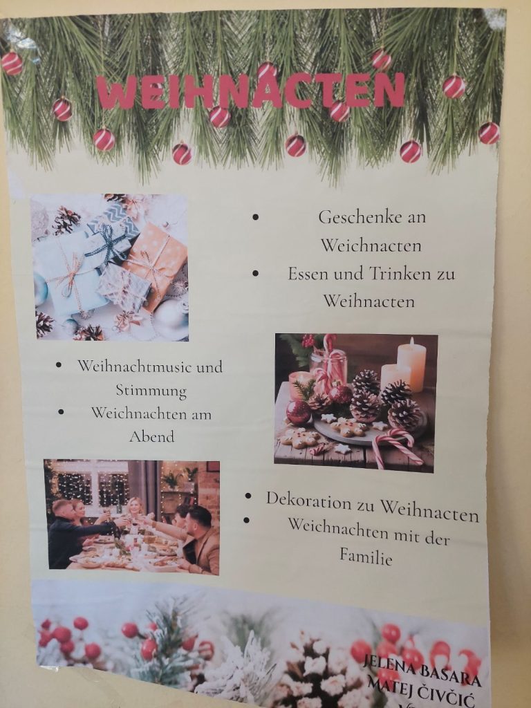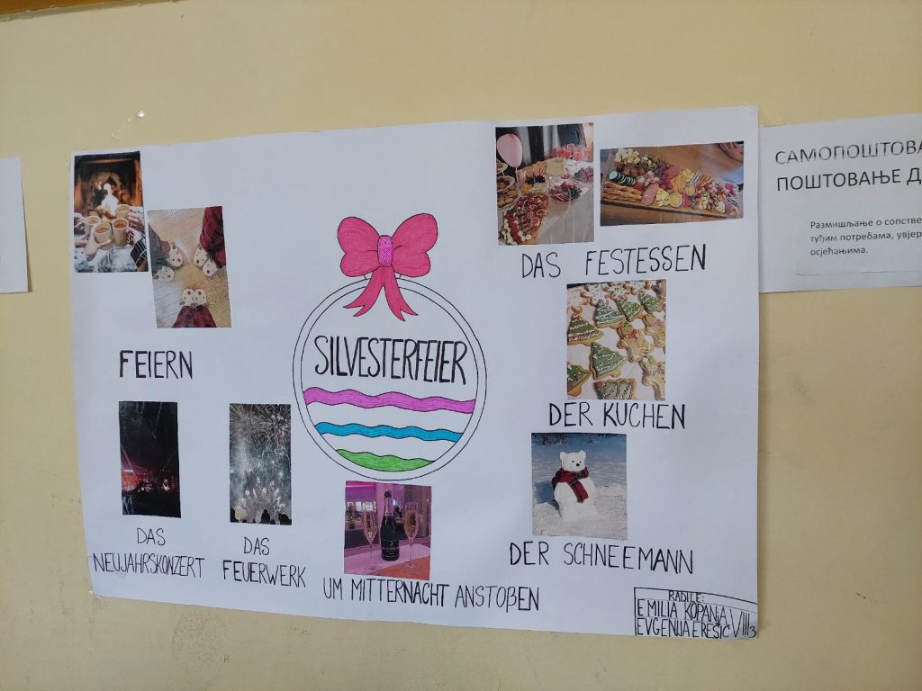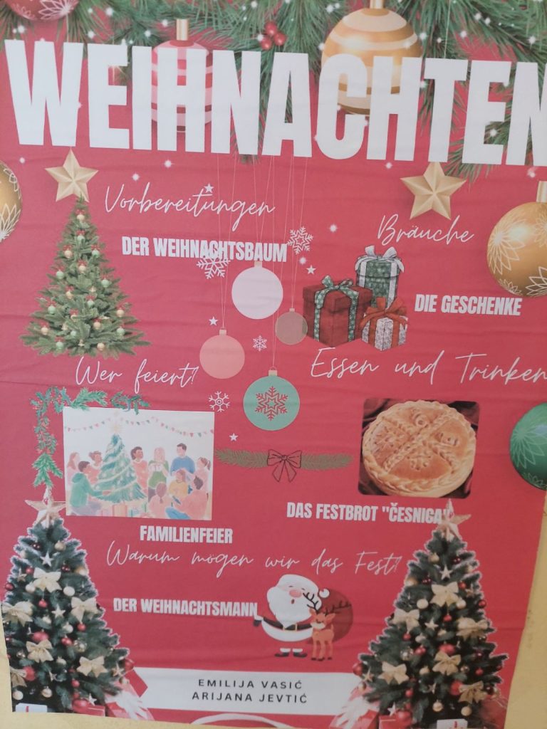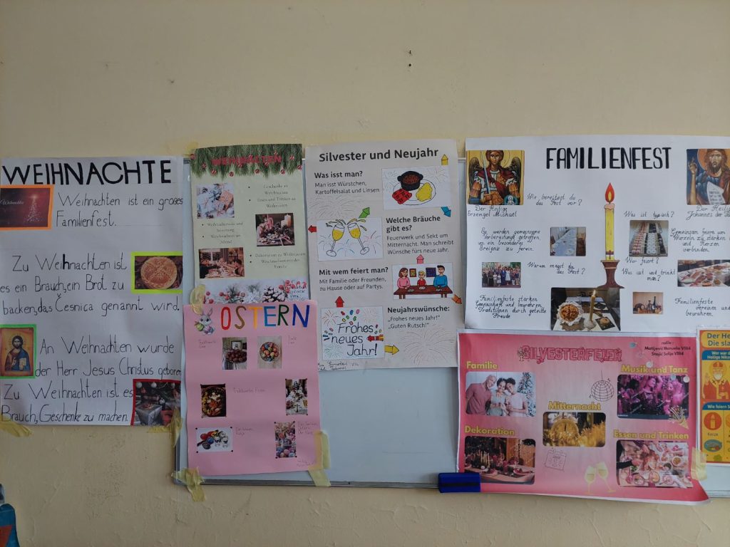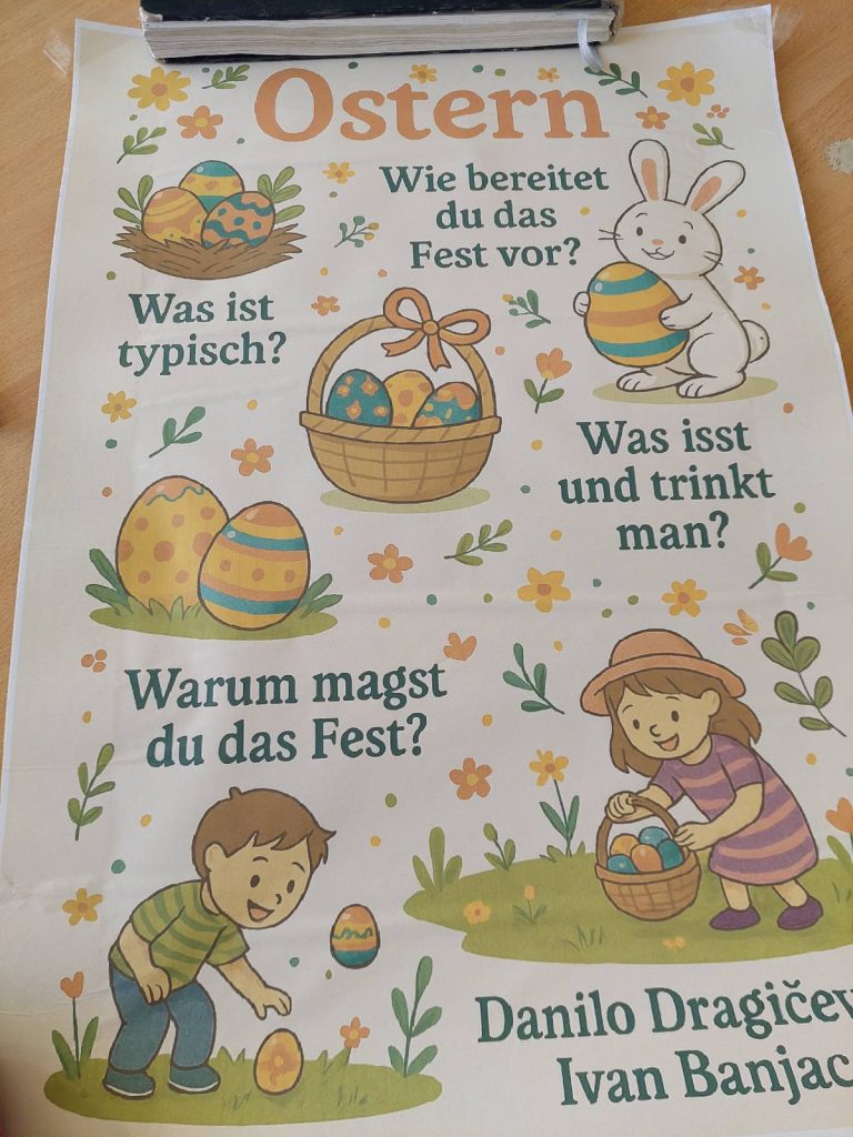 У петак, 25. априла, и у сриједу, 30. априла 2025. године, ученици осмог разреда (VIII3 и VIII4) радили су паное на тему „Празници (Wir feiern), гдје су на њемачком језику представили обичаје типичне за православну културу и разлике у односу на западну културу.