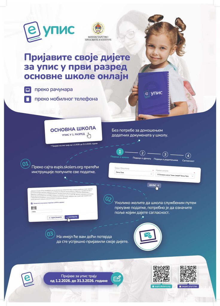 Евидентирање дјеце за упис у 1. разред  у школску 2026/2027. годину, родитељи могу обавити на један од сљедећа два начина: