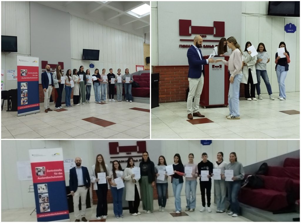 У петак 26. септембра у просторијама бањалучке Гимназије одржана је свечана додјела ДСД диплома за ученике који су прошлој школској години положили ДСД испит. Ученици који су од шестог до деветог разреда поред редовне наставе њемачког језика похађали и ДСД наставу, 12. марта полагали су писмени дио испита, а 27. и 28. марта усмени дио испита. Честитамо нашим ученицима Барбари Бркљач, Андреју Чабаку, Анастасији Качар, Николи Кецману, Хелени Келеман, Дуњи Костић, Ени Лакић, Дуњи Шервал, Лари Тешановић, Ањи Василић, Марији Видовић и Тамари Врањеш на оствареним резултатима.
